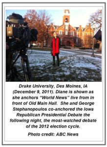 Diane could demonstrate grit, determination and toughness when it was required. In December 2011, we collaborated with ABC News on the production of the Iowa Republican Presidential Debate. Diane and George Stephanopoulos co-anchored the debate that was broadcast live from Old Main Hall on the campus of Drake University. Diane was feeling just plain lousy with a bad cold and touch of flu in the days before and day of the debate, but she gutted it out like the pro she is. It turned out to be worth the effort as the broadcast was the most-watched debate of the 2012 political cycle, and kick-started ABC News’ “Your Voice, Your Vote” coverage in the months that followed.