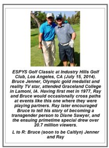 One of Diane’s biggest interviews was presented in April 2015. It was also one with which I had the slightest of connections. Bruce Jenner was a former Olympic gold-winning decathlete and reality television star. The New York native attended Graceland College (now Graceland University) in Lamoni, Iowa. Bruce was my playing partner in the ESPYS Golf Classic in July 2014 at a time when the tabloids were reporting that he had begun the transition to a woman. None of the rumors mattered during our round that day, and we had a great time as he entertained our foursome with stories about the recent, elaborate wedding of stepdaughter Kim Kardashian and Kanye West.