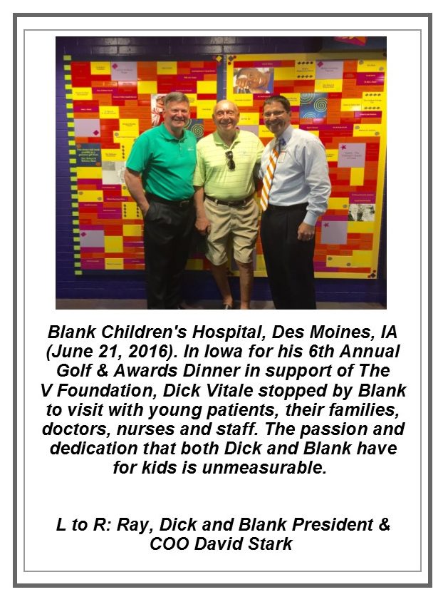 It has been gratifying to be involved over the years with various events in support of The V Foundation. Attending the ESPYS and participating in the ESPYS Celebrity Golf Classic is always gratifying. Dick Vitale hosts the annual Dick Vitale Gala near his home in Sarasota, FL with the proceeds specifically earmarked for pediatric cancer research. Our former station in Sarasota, WSNN-TV, produced and broadcast a Dick Vitale Telethon in 2015 and 2016 in support of this annual Gala. In more recent years, the station has produced a series of special reports that are presented in the week leading up to the Gala. The purpose of these efforts is to raise awareness of, and funds for, the fight against pediatric cancer.